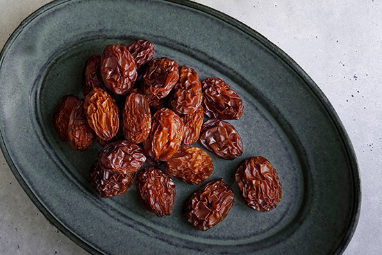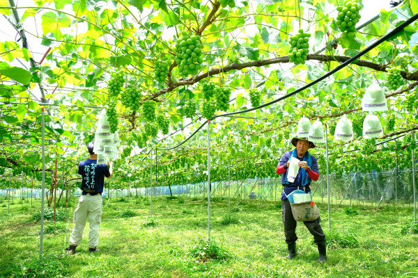 標高200mの山あいにある畑は、日当たりと水はけが良く、昼夜の寒暖差が大きい、ブドウを甘く実らせる理想的な環境です。同農園は、気候風土を生かし昔ながらの堆肥を活性化させる農法を取り入れ、自然の摂理に沿って育てることにこだわっています。完熟で収穫するシャインマスカットは、粒が大きく、糖度が高く、マスカット香と呼ばれる風味が際立ちます。このおいしさを乾燥で閉じ込めたのが、「ドライシャインマスカット」です。