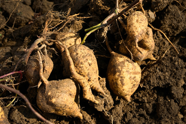 そもそもは島の人が自家用として栽培していましたが、平成に入って新居浜市の特産品としての生産が始まりました。ピーク時には出荷量が37トンもあったものの、島の人口減少と高齢化が進むにつれ生産する人も量も減ってしまいました。「新居浜の特産品である七福芋を守り、広めたい」と、「七福芋本舗」が生産や加工品づくりに取り組んでいます。本土部の遊休農地を活用して栽培を拡大しましたが、生芋で販売する量には限りがあり、かなり希少です。