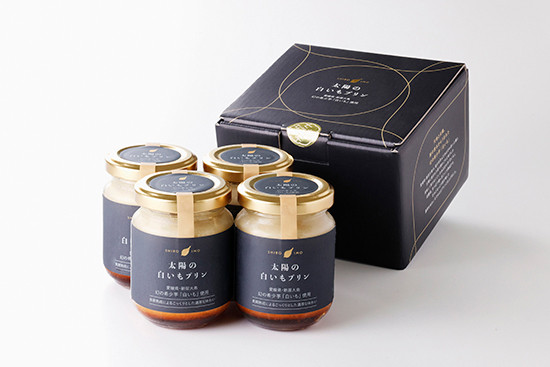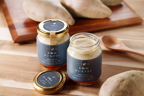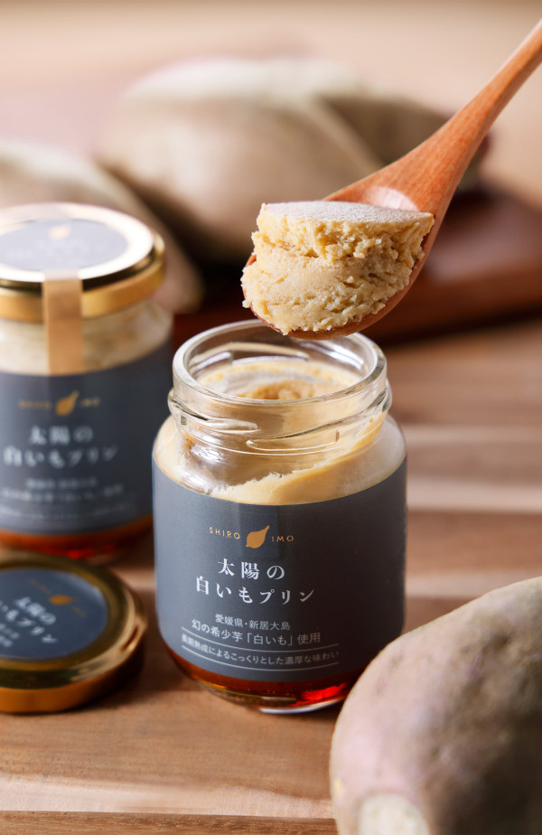 「太陽の白いもプリン」は、NPO法人「えひめおいしいもの協会」と、同会の一員である「七福芋本舗」がコラボレーションして開発したスイーツです。レシピを考案し、製造を手がけるのは、愛媛県産食材を使ったメニューを多彩に提供する、四国中央市の人気店「Restaurant&Cafe Riina」。「七福芋」のみを原料としたペーストをたっぷり使用し、プリン液との絶妙な配合で、芋の風味と食感を生かして仕上げています。砂糖の量を控えめにし、愛媛県四国中央市の豊岡農場が生産するブランド卵を使うプリン液と、カラメルソースにもこだわり、丁寧に一つ一つ手作りします。焼き上がりをすぐに冷凍することで、作りたてのおいしさを瓶に閉じ込めました。
