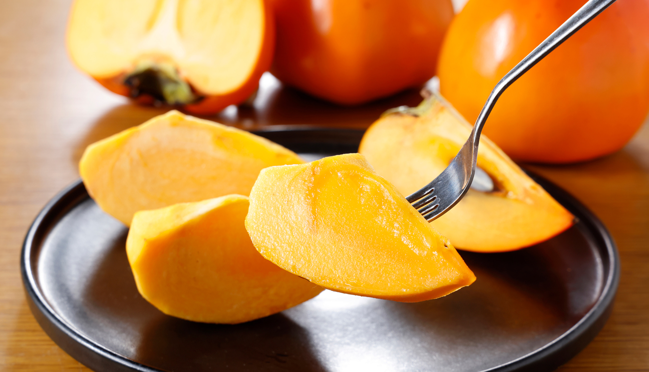 陽光を浴びて輝く赤富士のように美しく立派に実った柿。